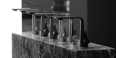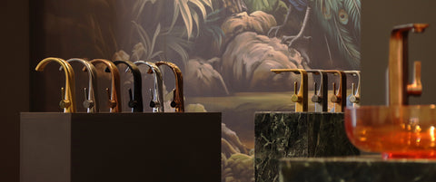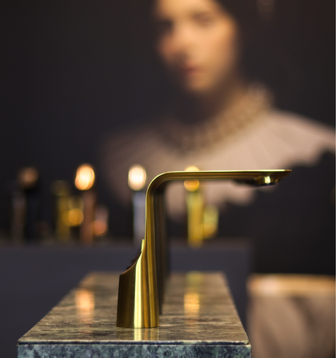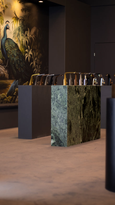 Presentation cubes made of green Verde Alpi marble added special accents. Their natural grain created a fascinating dialogue with the design series in Steinberg's surface finishes – including the new Brushed Gold, Brushed Gun Metal, and Brushed Copper. The interplay of light, material, and color lent the space an atmosphere of timeless elegance.