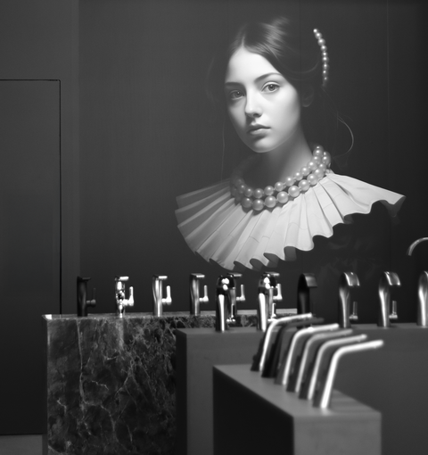 The design went far beyond pure product design. An oversized, AI-generated portrait of a young woman – inspired by 17th-century Dutch portraiture – lent the space a quiet, almost poetic depth. The presentation of the polyresin tubs fit seamlessly into this tranquil visual world: Backlit by large-scale LED walls in precise white light, the colored pigments in the surface unfolded their full radiance. The light made them literally glow – an effect that gave the objects an almost sculptural presence.