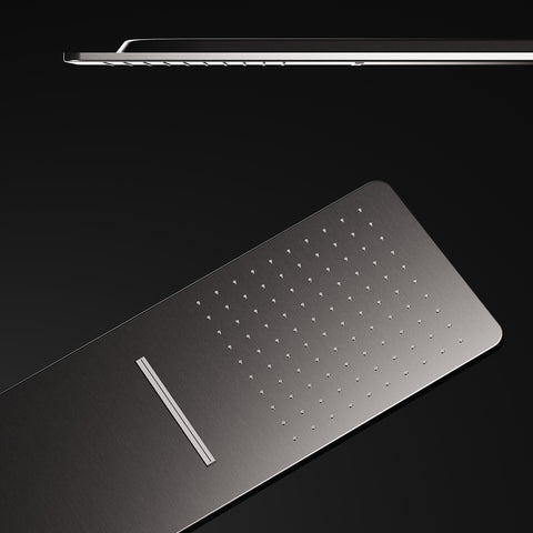 Steinberg greift die neue Oberflächenästhetik konsequent auf und überträgt sie auf die Regenpaneele. Durch ihre planen Flächen rückt die markante Bürstung kompromisslos in den Vordergrund.