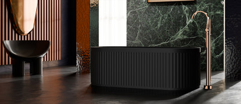 Rose Gold bringt Wärme in den Industrial Style – ohne ihn zu mildern. Der metallische Glanz trifft auf samtmatte Solid Surface-Oberflächen und schafft einen bewussten Kontrast. So entsteht ein Spannungsfeld aus Glätte und Struktur, in dem die Serie 280 gezielt zur Geltung kommt.
