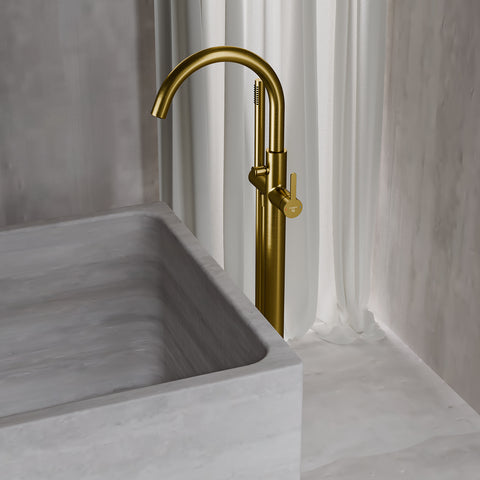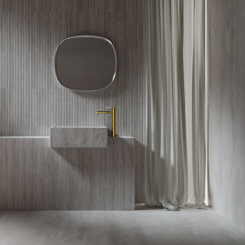 Brushed Gold reagiert auf seine Umgebung: In dunklen Interieurs setzt es leuchtende Akzente mit spannungsvollem Kontrast, während es auf hellem Stein oder Beton sanft und warm wirkt. Diese Vielseitigkeit macht die Serie zum idealen Begleiter für moderne Badarchitekturen, die mit Material und Stimmung spielen.