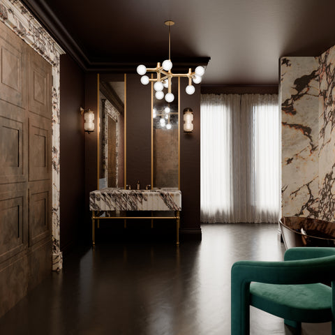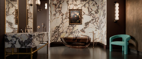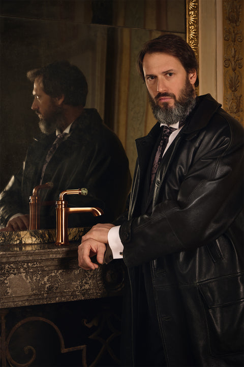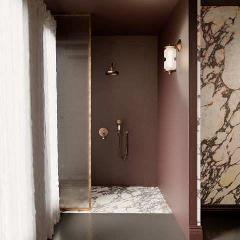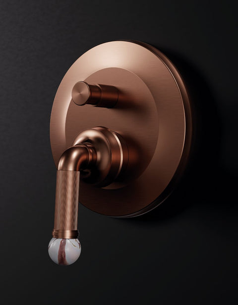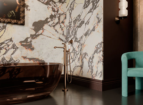 Charakteristisch für die Serie ist das Spiel mit Kontrasten: klare Geometrien treffen auf organische Elemente, technische Präzision auf haptische Raffinesse. Die markanten Bedienelemente aus echtem Marmor – erhältlich in Calacatta Viola, Nero Marquina und dem exklusiven Alpe Verdi – setzen dabei einen bewussten Akzent. Jede Oberfläche bringt ihre eigene Tiefe und Individualität mit und macht jede Armatur zu einem Unikat.