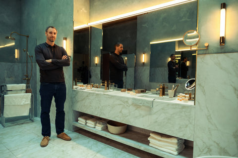 „Wir wurden angefragt, weil man bei so einer Produktion nichts dem Zufall überlässt – auch nicht die Sprache der Materialien und des Designs“, sagt Johannes Löhnert, Geschäftsführer von Steinberg, der persönlich am Set war, um die Inszenierung der Produkte zu begleiten.